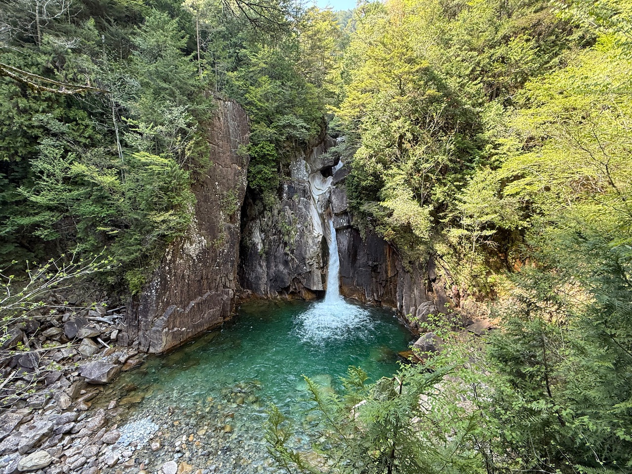 木曽川の支流である柿其川の最下流に懸かる「牛ヶ滝」の落差は18m、エメラルドグリーンの滝壺にまっすぐに落ちる美しい直瀑です。