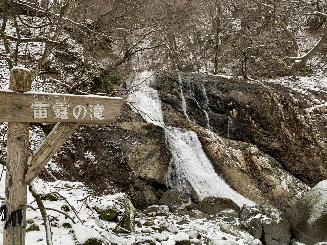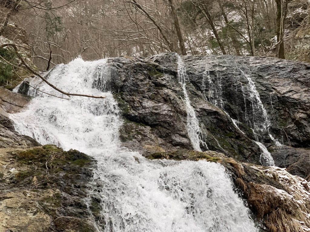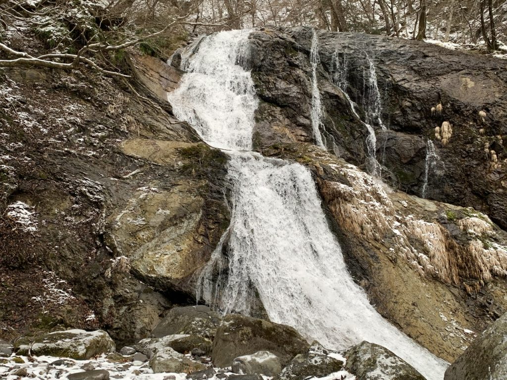 だんだんと水の流れる音が聞こえてきて、河川沿いを歩いてスタートから50分ほどで滝に到着します。