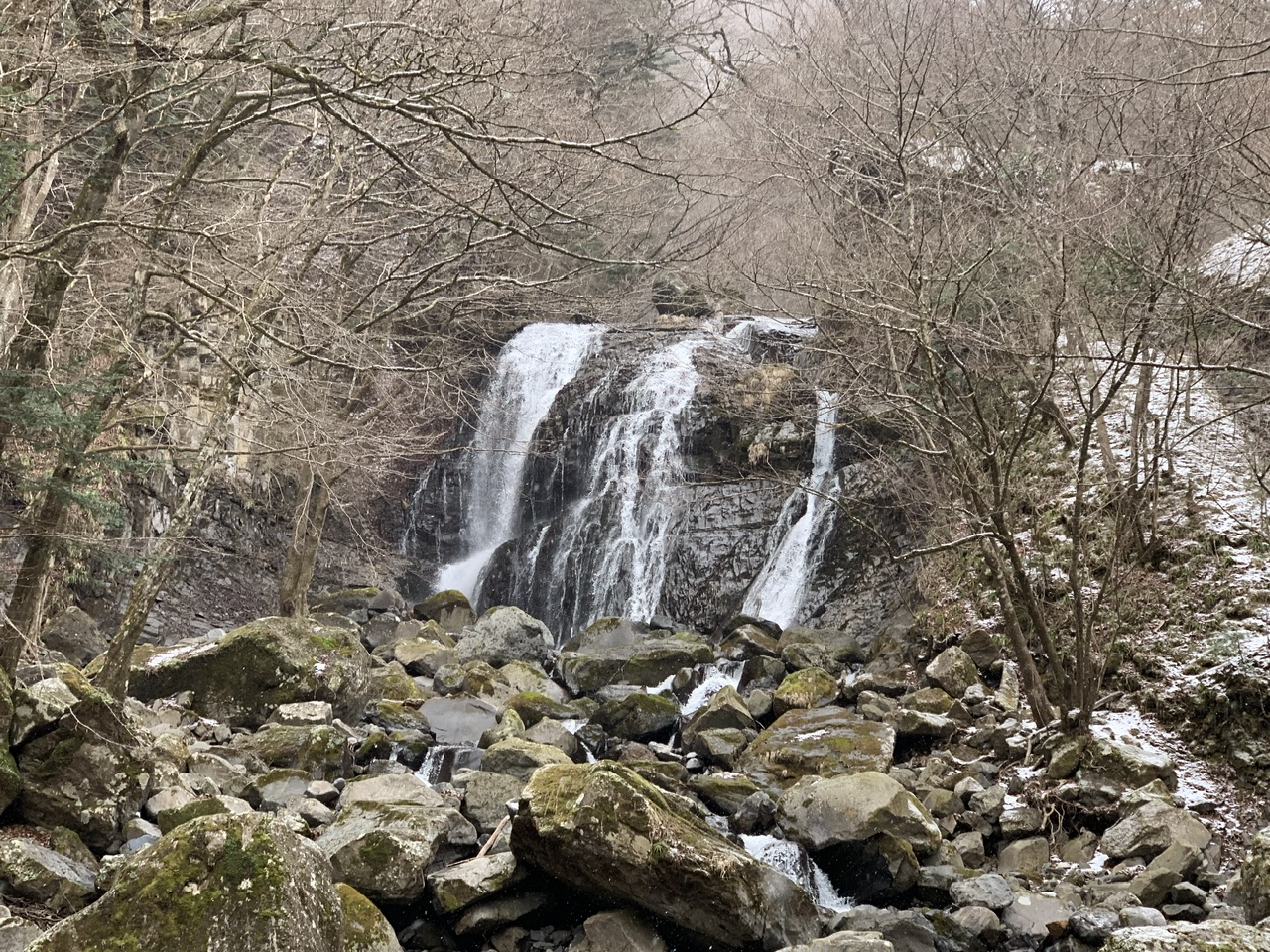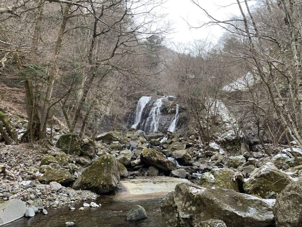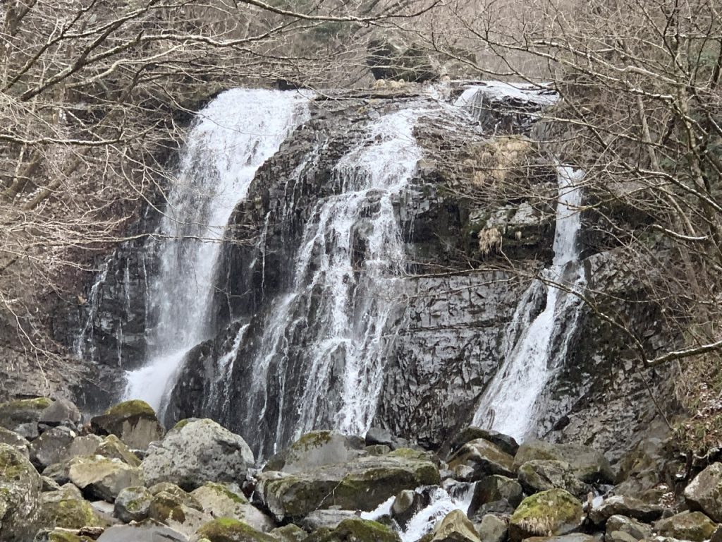 訪問した時は1つの滝かと思っていましたが、左側の「霹靂の滝」は豪快に水が流れていますが、「咆哮の滝」は右側にあるようで雪が積もっている岩壁かと思っていました。