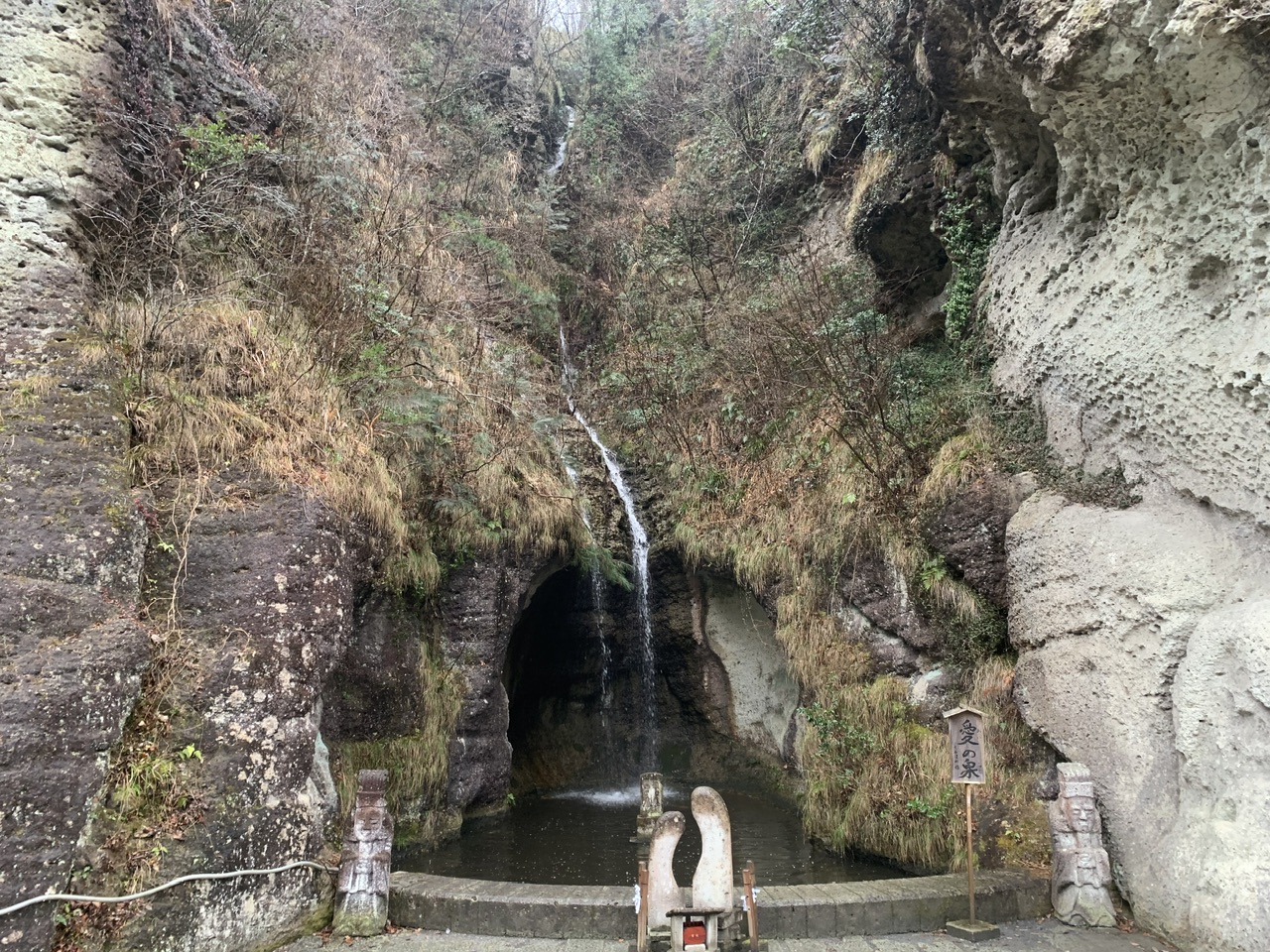大谷資料館の駐車場から切り立った石の造形を眺めながら少し歩くと資料館の入り口手前に滝が現れました。