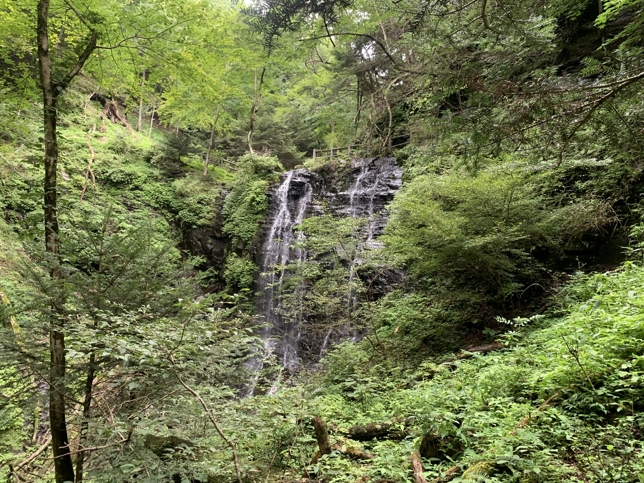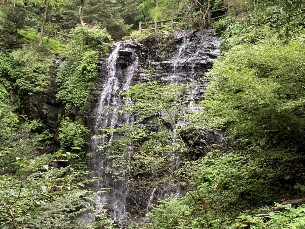 凸凹の地層が美しい梵天の滝が見えましたが、滝壺までは倒木や草木が多いため侵入できずにこの場所で断念しました。