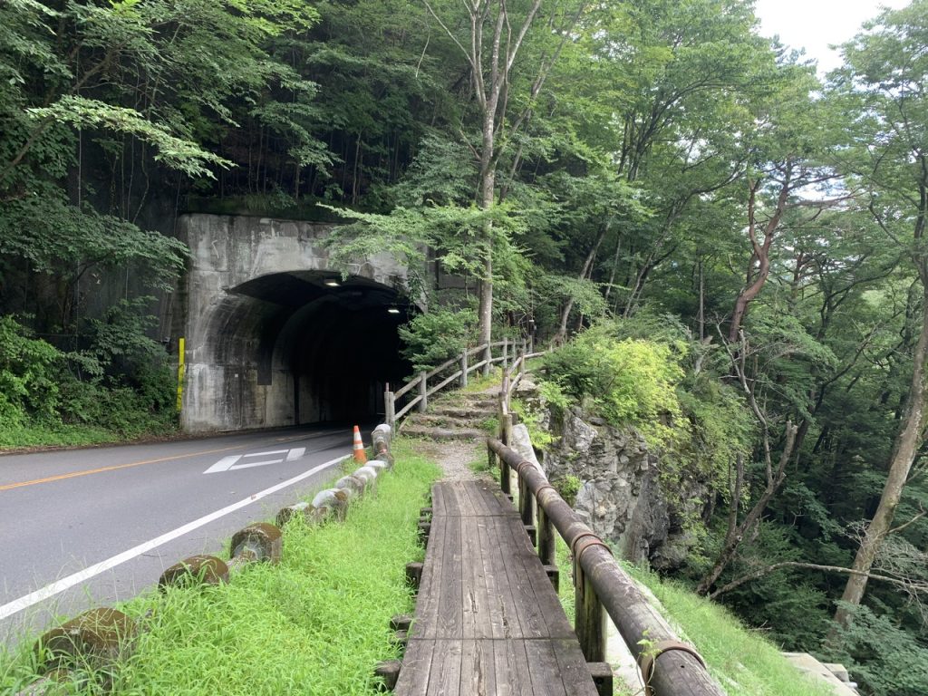 滝へ行くには橋を渡ってトンネルの横にある散策路を進んでいきます。