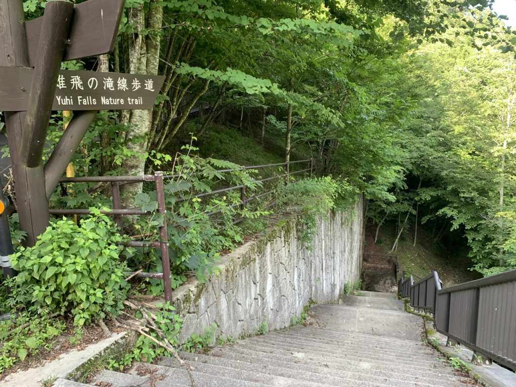 雄飛駐車場に車を停めて橋を渡った所に階段があり、川沿いの遊歩道へ下っていきます。