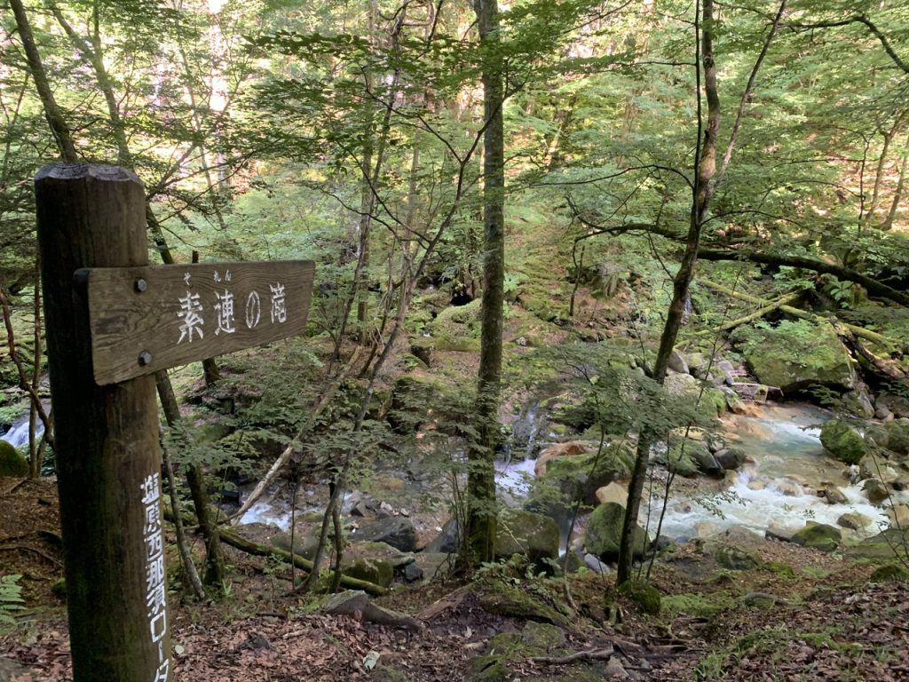 整備された遊歩道は歩きやすく川沿いを10分ほど歩いていくと素簾の滝の看板がありました。