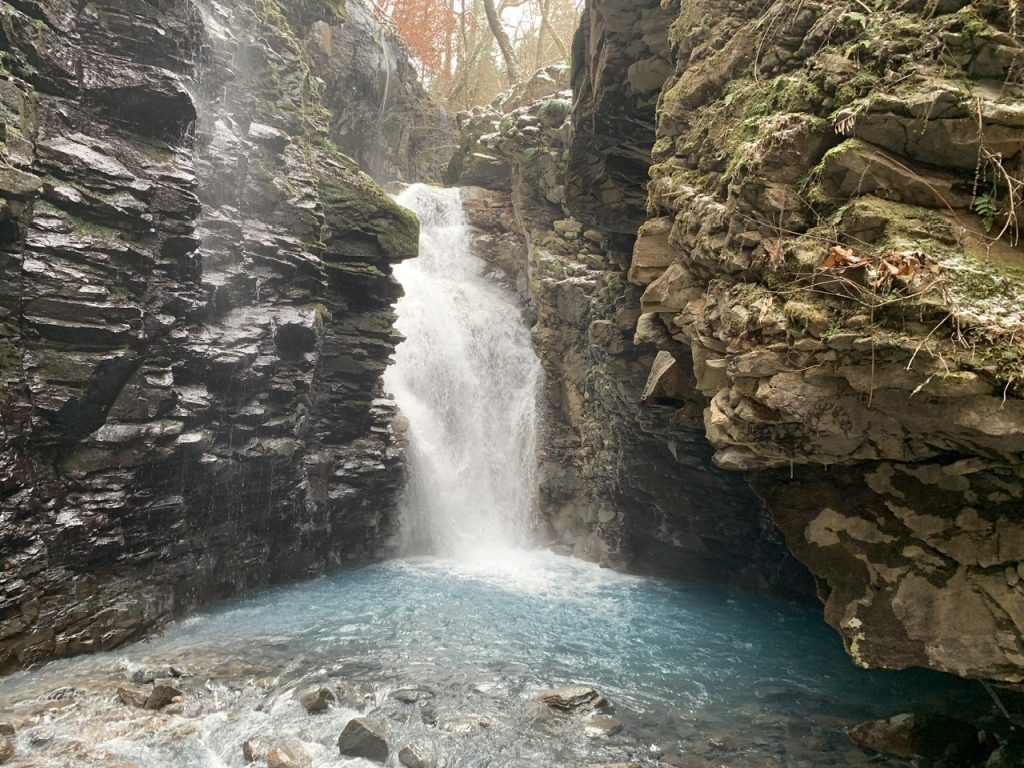 ゴツゴツとした岩から流れる白い滝、ブルーの滝つぼがとても美しかったです。