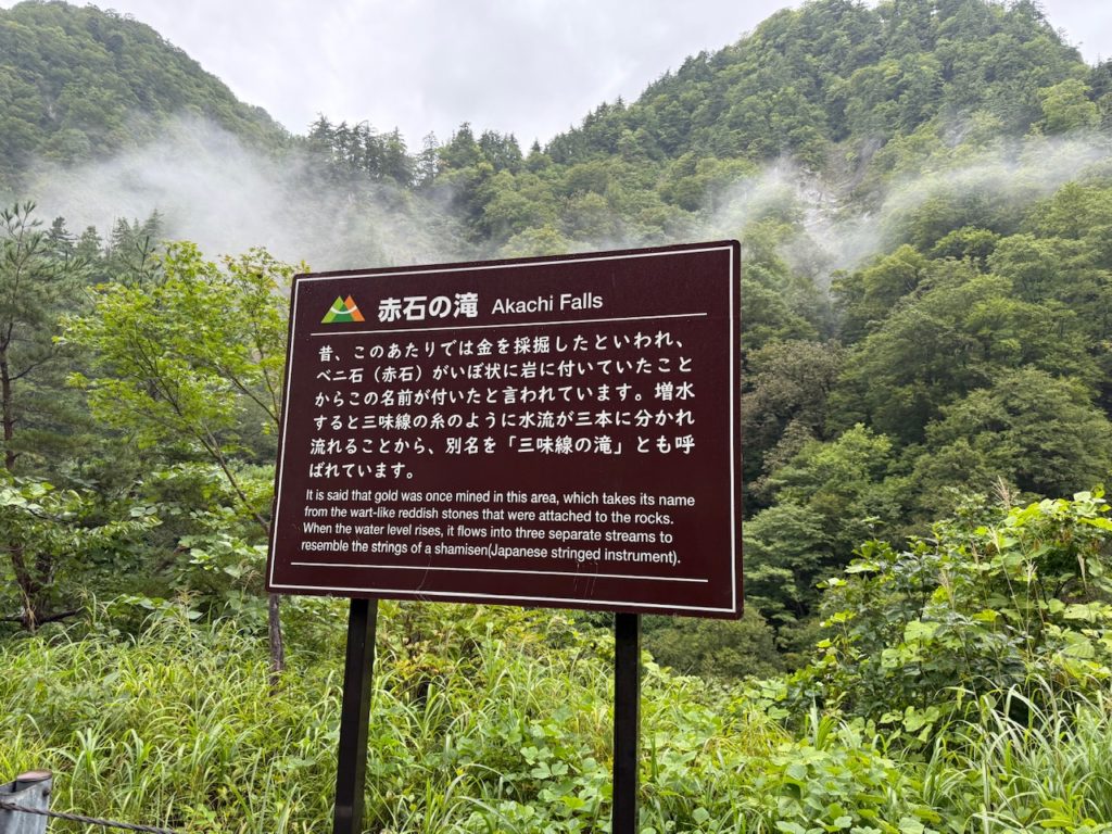 石川県側に急峻なV字谷の峡谷が9kmほど連続する「蛇谷峡谷」に懸かる「赤石の滝(あかちのたき)」は、昔、金を採掘したと言われ、ベニ石(赤石)がいぼ状に岩石に付いていたことから名前が付けられており、水が増水すると三味線の糸のように三方に分かれて水が流れることから三味線滝とも呼ばれています。