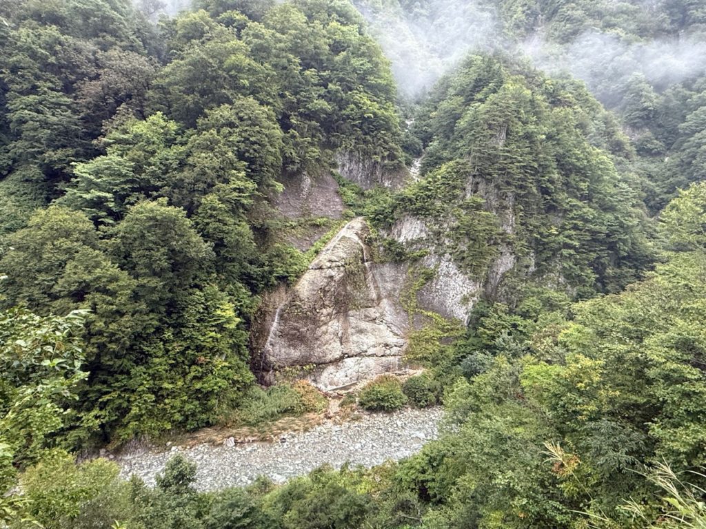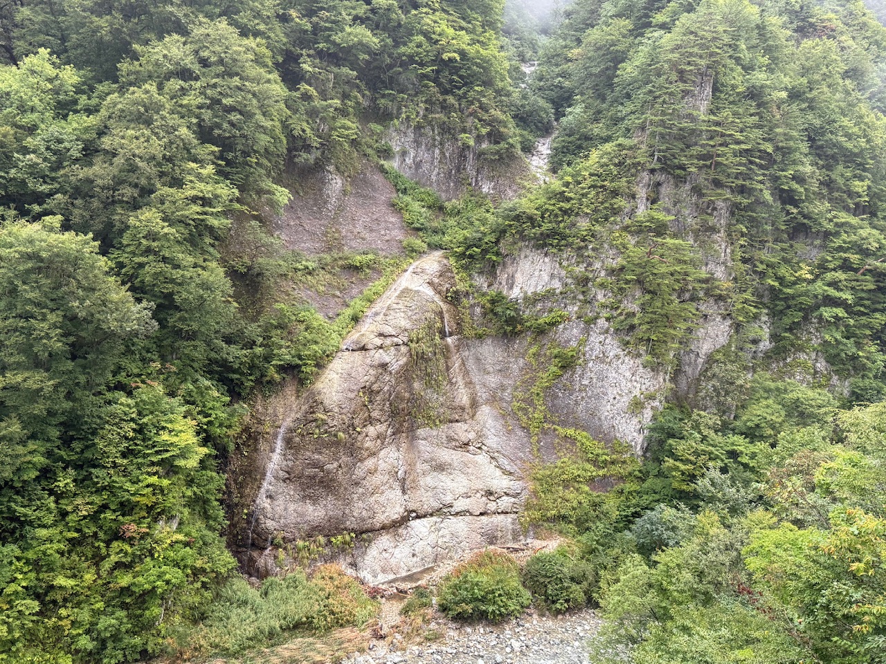 山の斜面に三角形のおにぎりのような形の岩壁から水が流れ落ちていました。