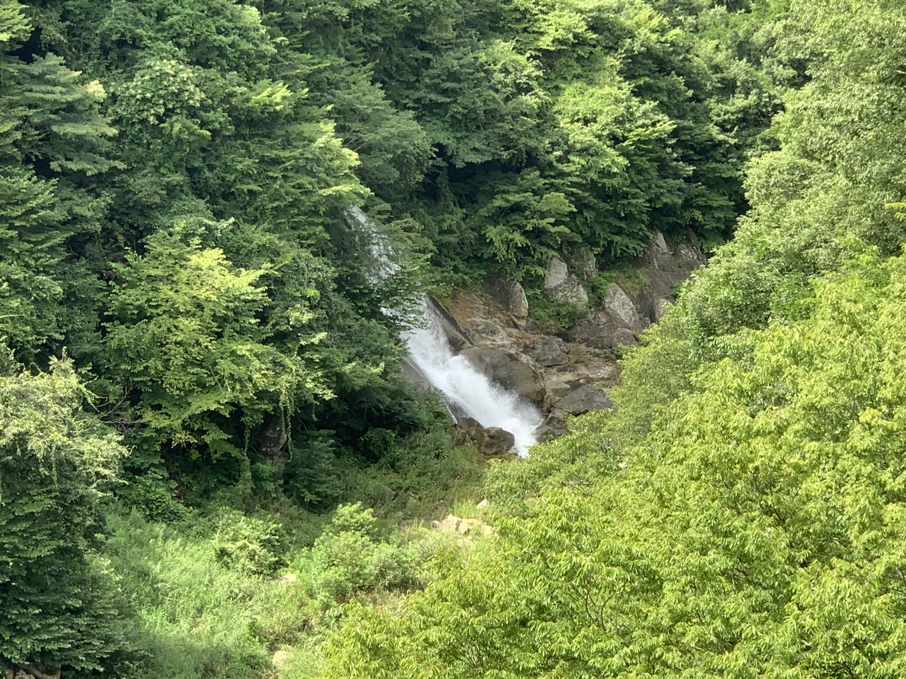 木が多いので滝が隠れてしまい、全体を見れる位置がないので、残念ながら素敵な滝の全貌は見れませんでしたが、迫力ある滝でした。