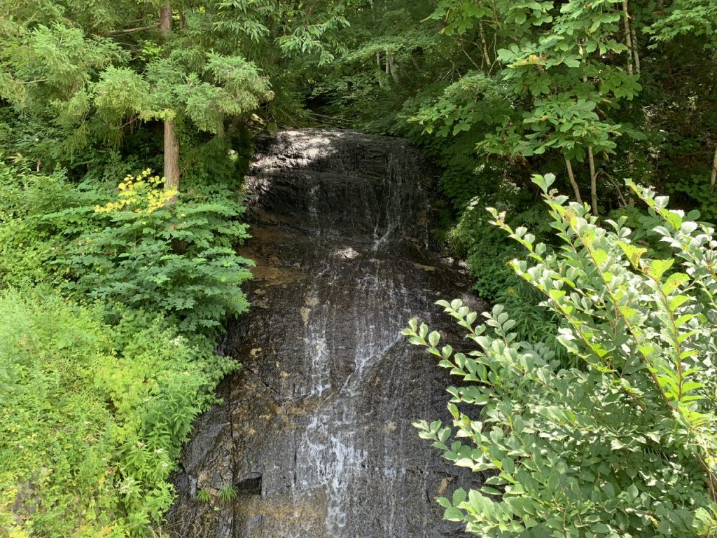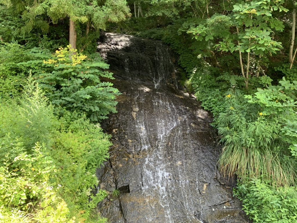 車道沿いの反対側にある川に掛かる滝かと思って探していたら、反対の崖から流れている滝でした。