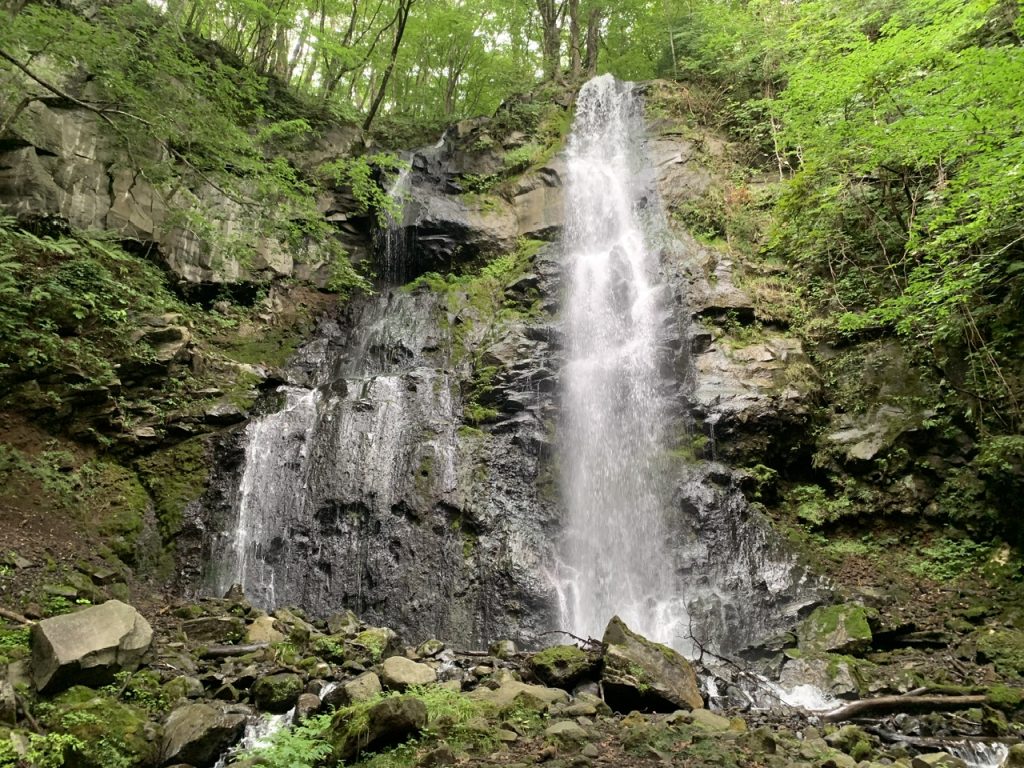 私が訪問した時は左の滝は、チョロチョロと静かに流れている程度で元気がない状況でしたが、岩壁の黒い岩肌が見えるようになっていて荒々しい感じがかっこよかったです。