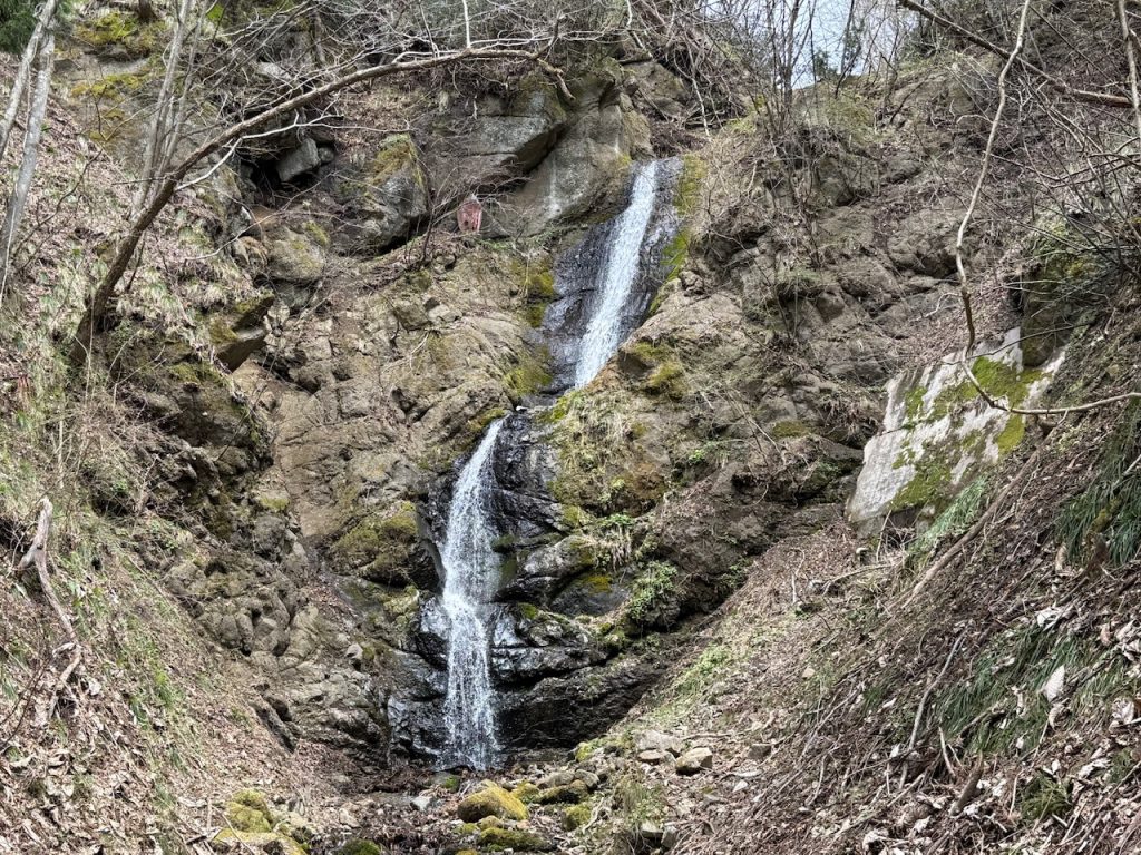 岩壁に二段になつて流れる水の流れが迫力があります。