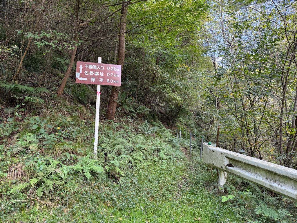車道沿いに看板が立てられていましたので、道路脇に車を停めて山道を入っていきました。