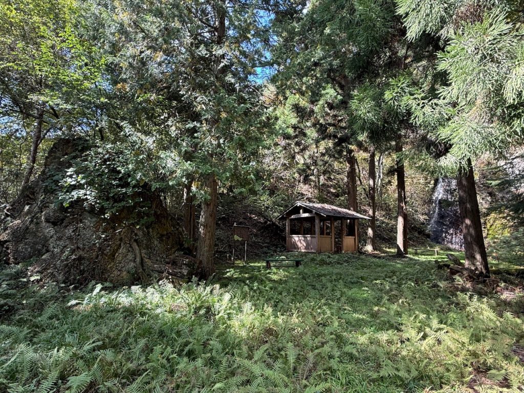 東屋の奥に高くまでそびえ立っている絶壁の岩壁に滝がありました。