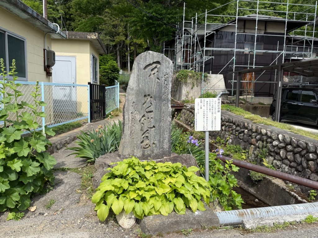 温泉街から細い路地を入り、急な坂を上っていくと水路に石碑が立っていました。