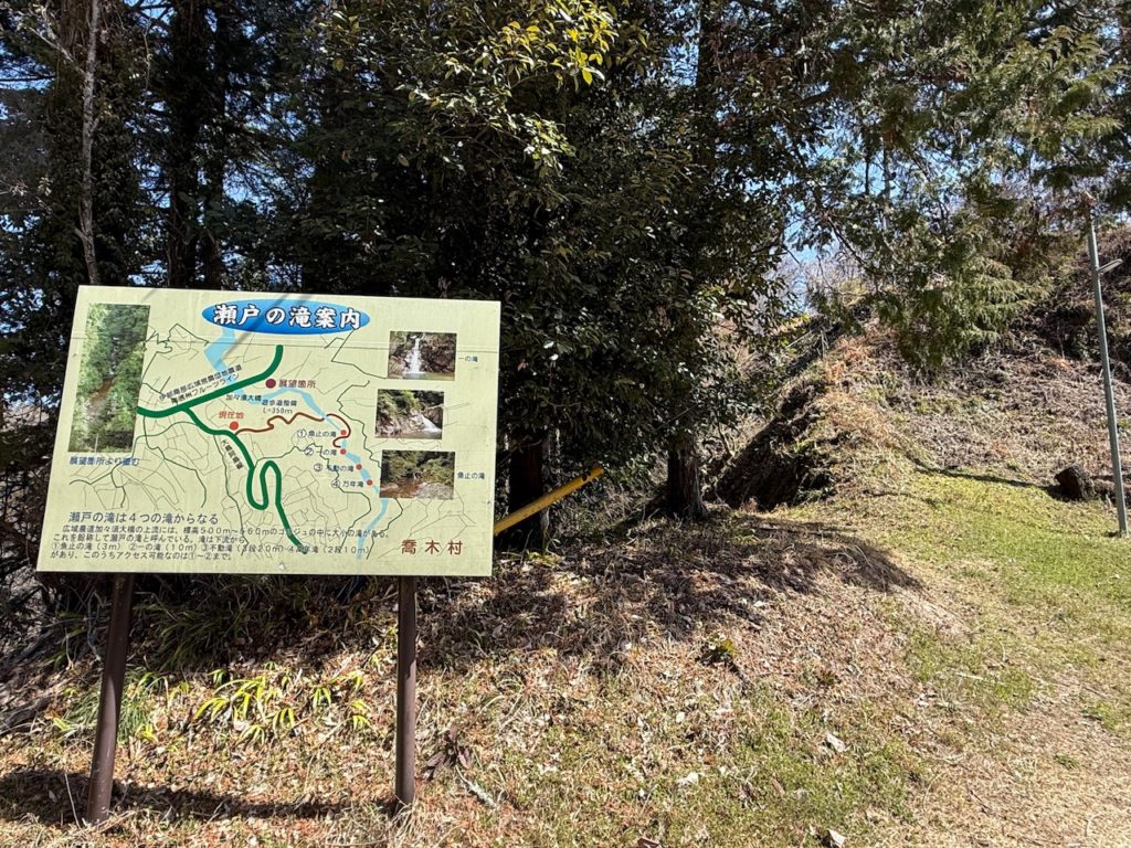 県道456号線を走らせて加々須川大橋から横道に入ってすぐに滝の案内板がありました。