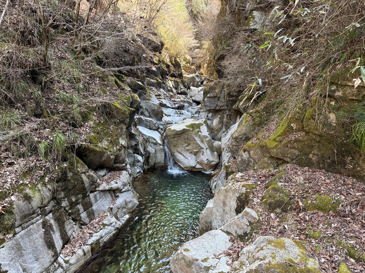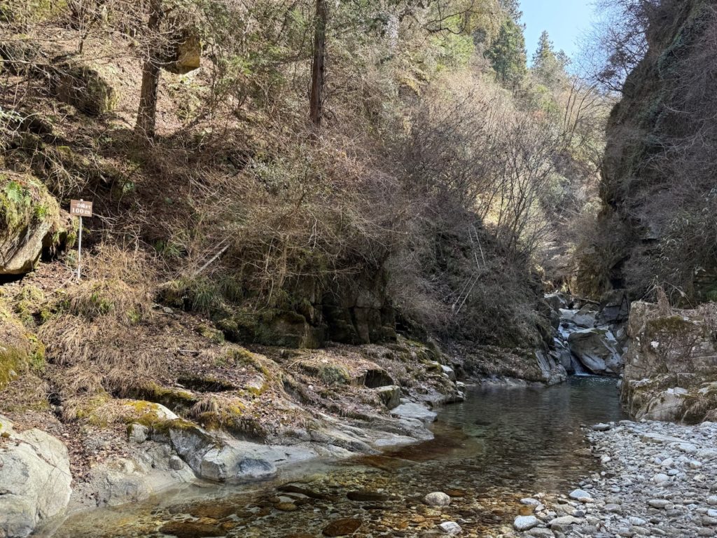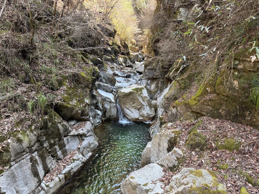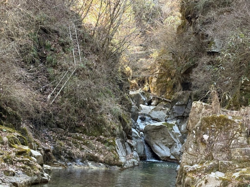 河川までたどり着くと奥に滝がありそうな雰囲気ですが、山の斜面に囲まれていて近づくことができません。