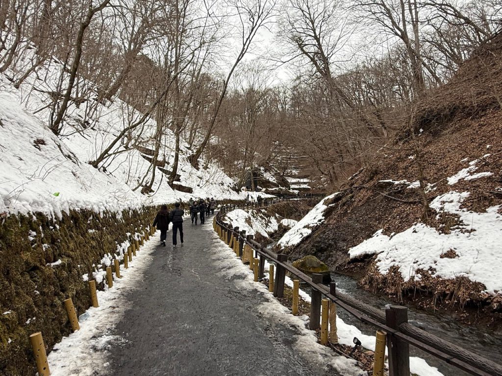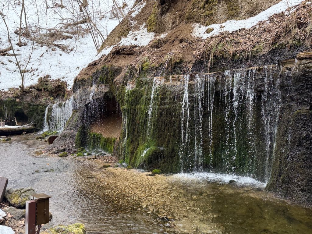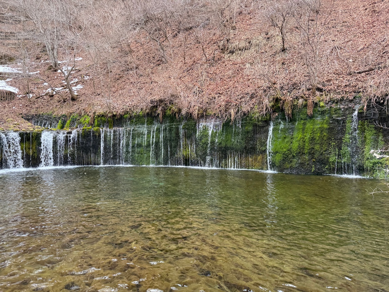 落差のある滝ではありませんが、横に70mにわたって一直線上に岩肌から湧き出る水が美しくて驚きました。