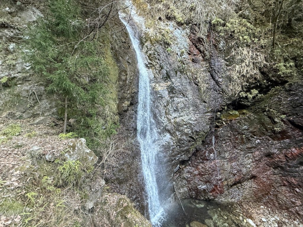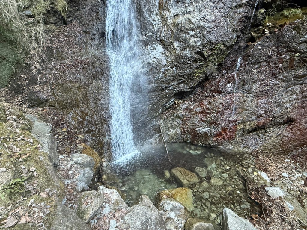 遊歩道と言うほど整備はされていませんが、川沿いを2分ほど歩いていくと目の前に滝が見えてきました。